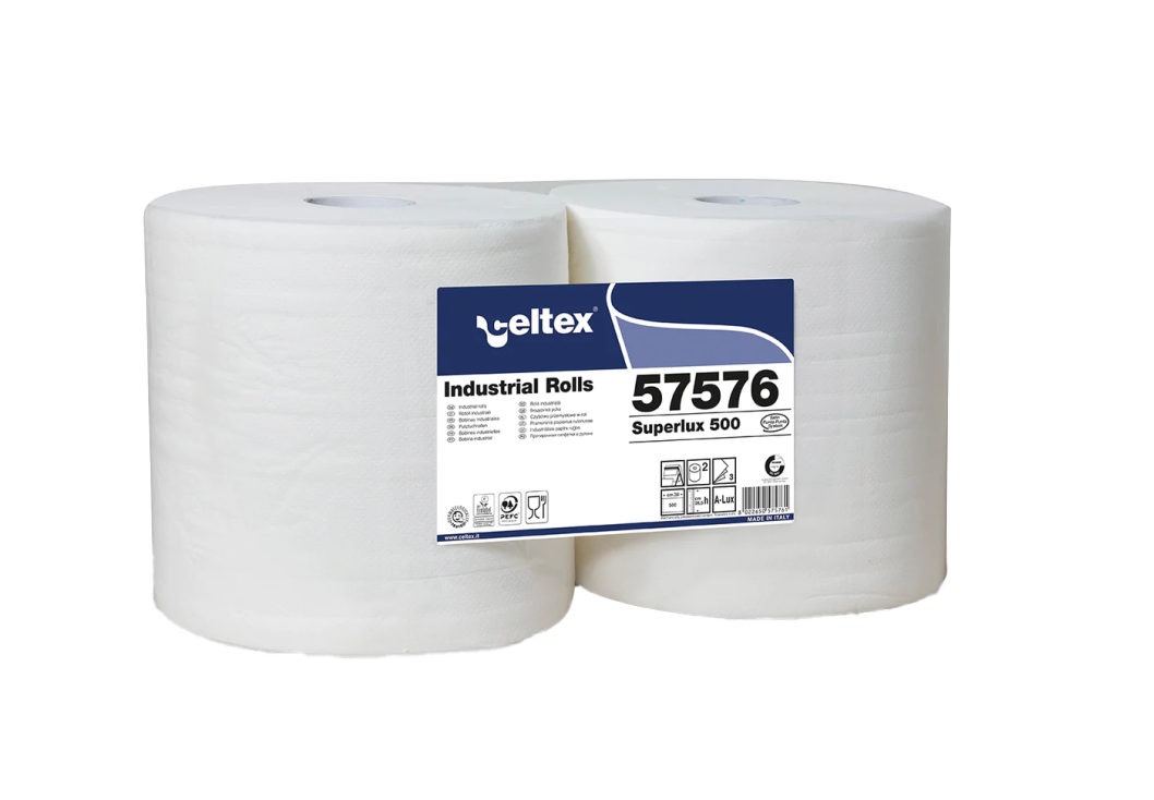 Rotolone industrale realizzato con un mix selezionato di fibre di cellulosa che garantiscono una resa in uso superiore del prodotto rispetto alle bobine classic he.