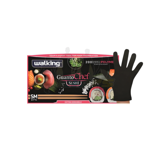 200 Guanti Monouso in CPE per Chef Sushi. Il colore nero e il design ergonomico con microgrip garantiscono una presa sicura, mentre la taglia unica M/L assicura una vestibilità comoda per tutti gli chef.