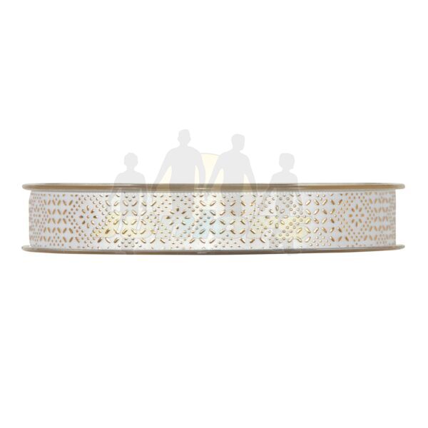 Nastro in doppio raso bianco con stampa oro in rilievo su un lato.